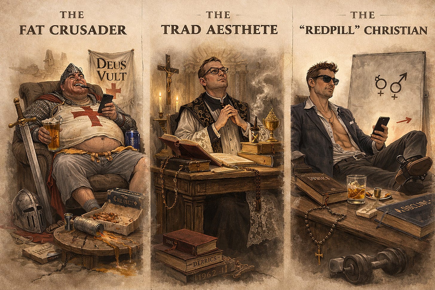 The Crusader LARPer: This is the guy who’s obsessed with medieval Christendom, who reads about the crusades constantly, uses crusader imagery, loves warrior saints, and “Deus Vult” memes. Now, these things are not bad in and of themselves —we should all learn from the warrior saints and crusader imagery is phenomenally motivating—, the problem is when these things become a sort of escapism from a life of laziness and effeminacy. It’s hollow and performative when the guy with the crusader profile pic can’t even fast on Fridays or won’t make a genuine effort to discipline his body by practicing asceticism and self-denial.