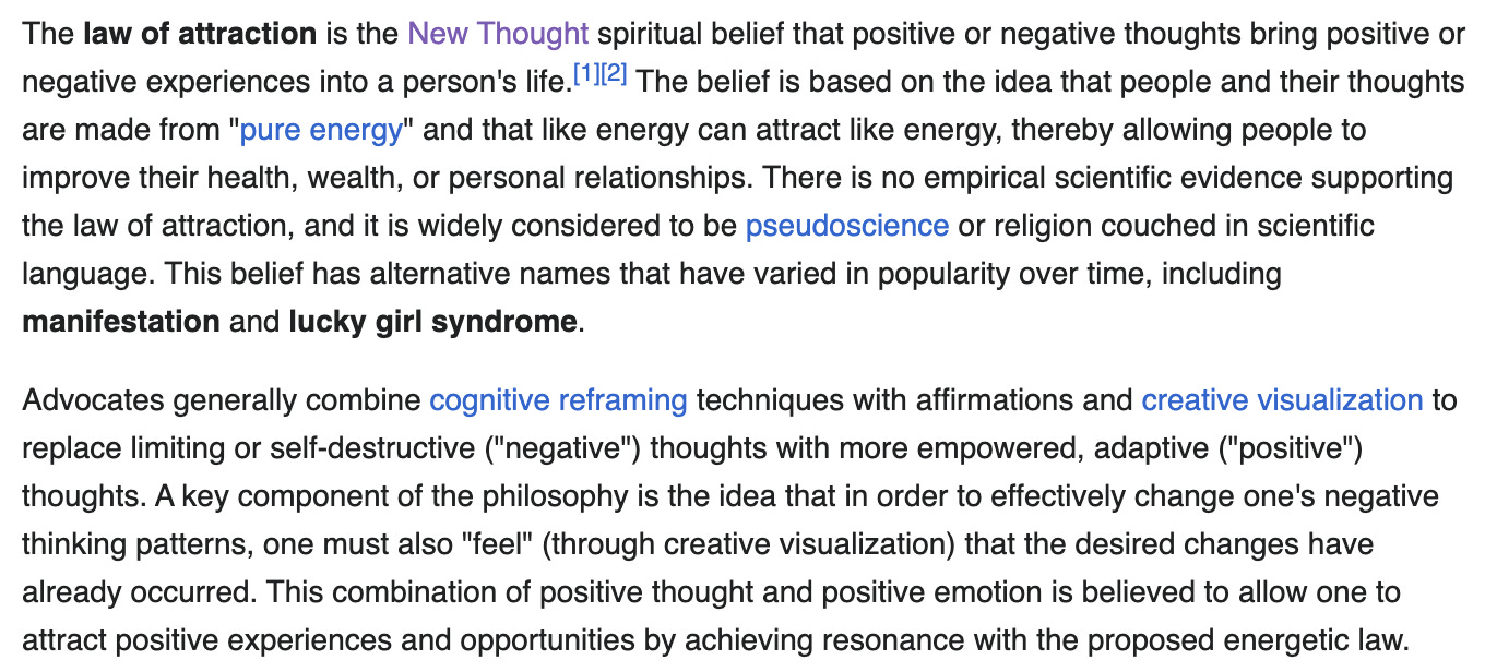 The main problem I now see with the law of attraction as it is marketed is that people think it’s some sort of magical, “energetic”, “spiritual” concept of manifestation of realities through the power of “thought energy”, simply because making it sound mystical and magical makes it easier to sell. The law of attraction, the actual, real one, is nothing of the sort. Let me explain.