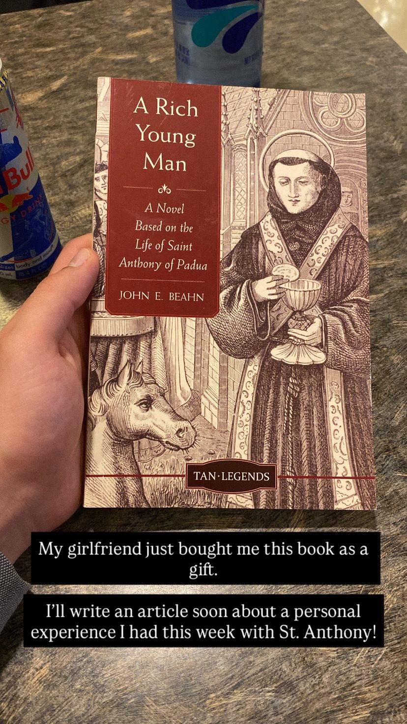 My girlfriend, a cradle Catholic who’s very close to the saints and who deeply understands their power, has been helping me out, gifting me books about them and helping me understand some things. She was with me in DC last week, and she’s a key part of this story of me meeting Saint Anthony.
