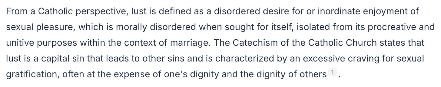 A quick note before you move on: I decided a while ago that I would never paywall articles talking about lust, chastity, and sexual immorality. I know this topic is a big pain for many men, and I could get a lot of new paid subscribers if I paywalled it, but I don’t want to charge for any helpful advice I might have because I have seen in the men close to me the grip of this vice and this battle is a cause that I hold close to my heart.