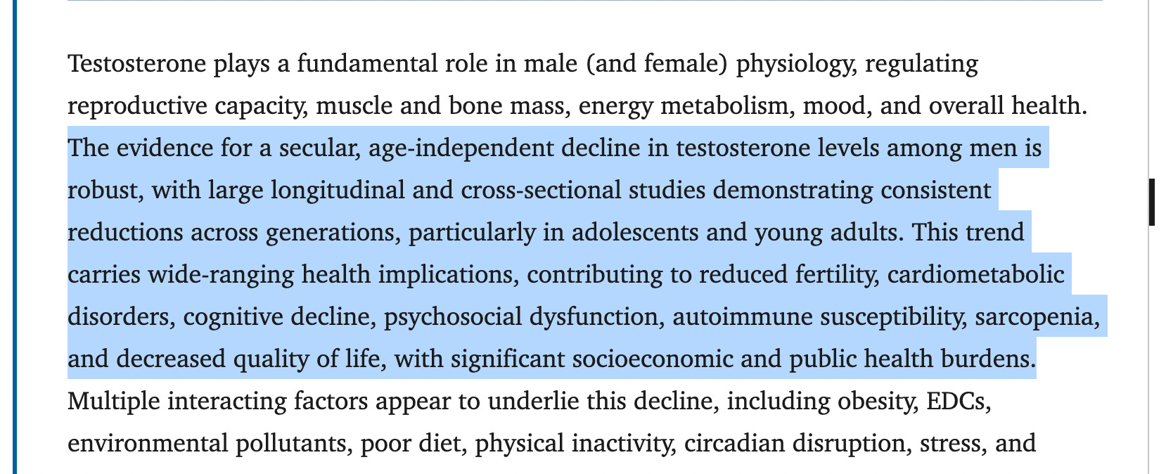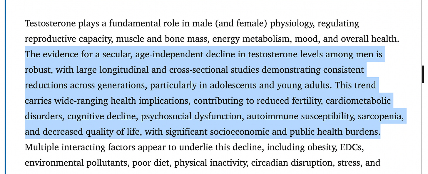 This has become a mainstream talking point, and almost all who have investigated this issue agree that the decline in testosterone levels among western men is a serious cause for concern3: